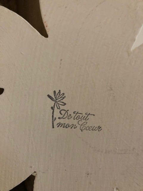 Houten bloem, mat wit geschilderd. De verf heeft wat smoezelige plekjes, deze kun je schoonmaken met een natte doek, en waar nodig wat bijschilderen. Let op: SALE; kan niet geruild worden