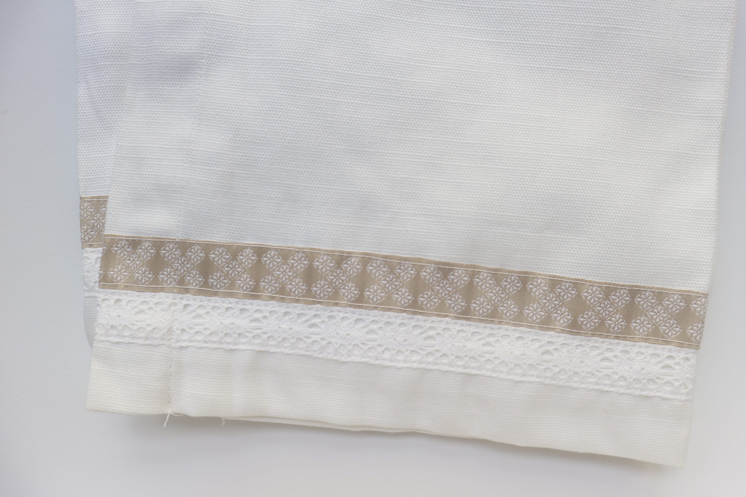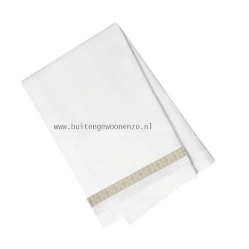 De ruime keukendoek heeft een afmeting van 45 x 65 cm en is afgezet met een bies in zandkleur én een randje van wit kant.